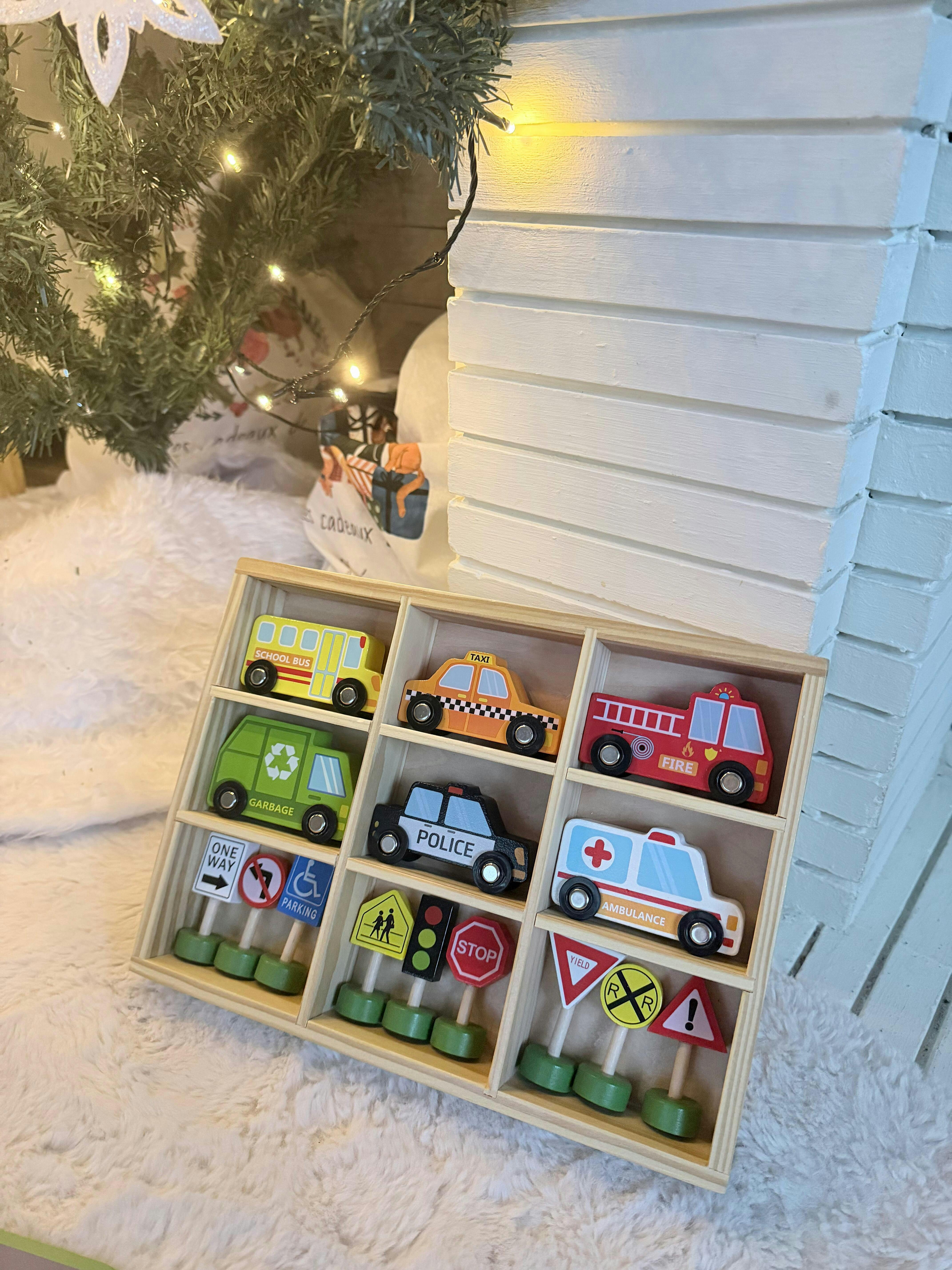 Cet ensemble comprend une variété de véhicules de transport et de panneaux de signalisation, permettant aux enfants de construire leurs propres routes et scénarios. Des voitures et des bus aux panneaux d'arrêt et aux feux de circulation, chaque pièce est conçue pour inspirer le jeu imaginatif. En disposant les pièces, les enfants apprennent les règles de la route, la sécurité routière et l'importance de suivre les panneaux, tout en s'amusant et en développant leur pensée créative.